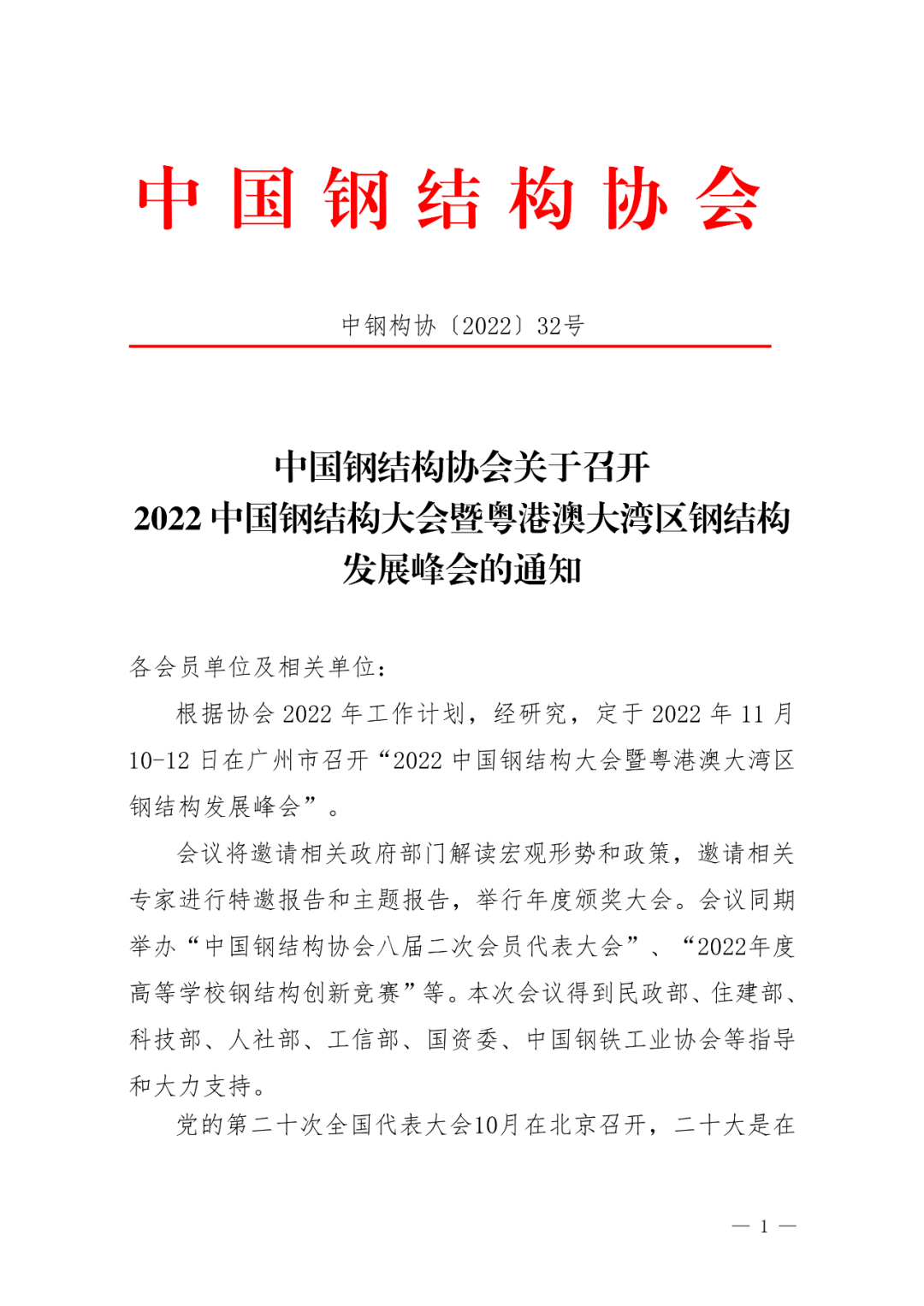 【协会通知】中国钢结构协会关于召开2022中国钢结构大会暨粤港澳大湾区钢结构发展