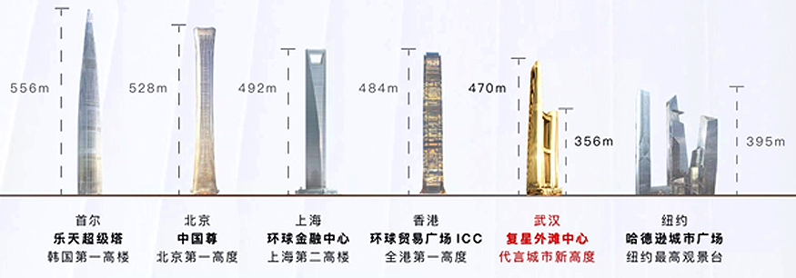 复星提出规划设计主塔约470米高、副塔约356米高的世界最高连廊双子塔,目标超越吉隆坡的双子塔,令武汉“长高”的同时,成为武汉乃至中国的一张城市名片。