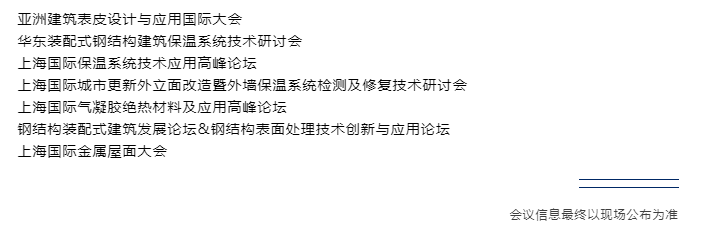 中国建筑业协会钢木建筑分会年度会员大会 深圳建筑表皮设计与应用国际大会 深圳国际金属屋面大会 大湾区国际建筑光伏(BIPV)创新发展论坛 大湾区智慧建筑与城市更新发展峰会 深圳国际门窗幕墙高峰论坛暨采购供需对接会 MBE“五新技术”新品发布会 建筑钢结构行业招投标市场趋势分析及项目分享会 |